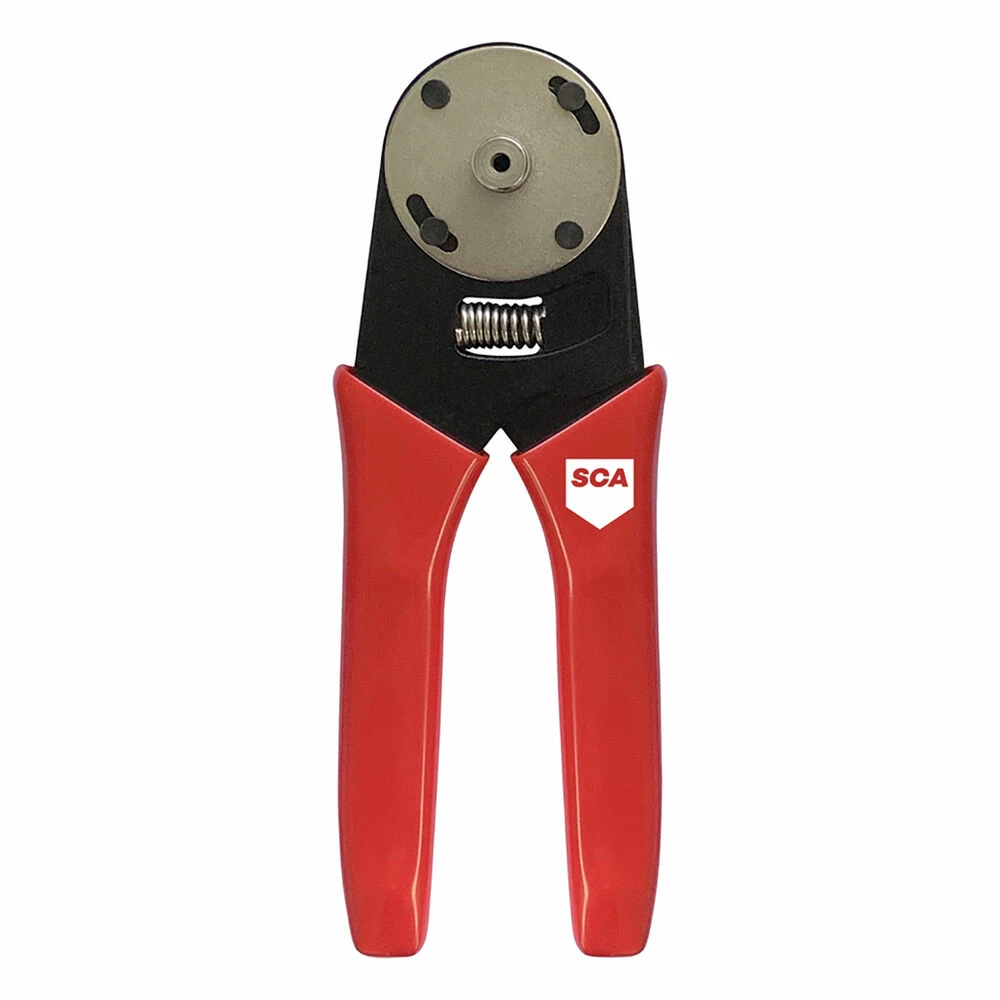 The SCA DT Connector Ratcheting Crimping Tool is a handy tool to crimp round barrel contacts, pin and sockets. The tool has a closed solid barrel for quality crimping of solid pin and socket connectors. It suits size 12, 16 and 20 pin and socket contacts, and is made from durable carbon steel.
