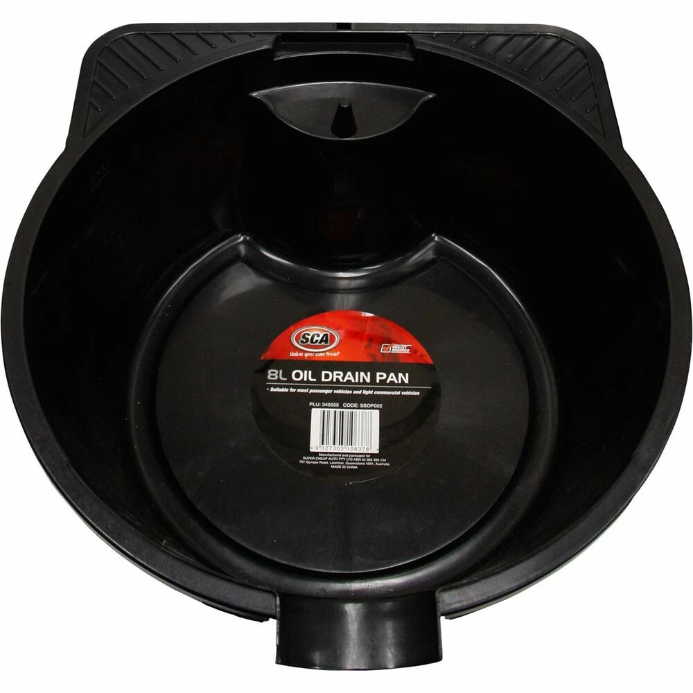 Draining engine and driveline oil is easy enough, but how to catch it? SCA has your back with an oil drain pan to suit every vehicle. SCA oil drain pans come in 5, 8, 13, and massive 18 litre sizes β great for everything from motorcycles to cars, and even small trucks. The three smaller pans feature a drain post on which the used oil filter can drain, and when the whole job is done β each pan has an integrated pourer; making it easy to dispose of the waste oil. Use it for every service; or place it to catch oil leaks and prevent stains. An SCA drain pan is a staple in every service kit.