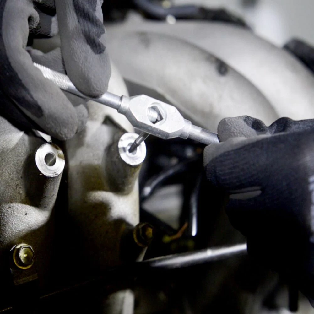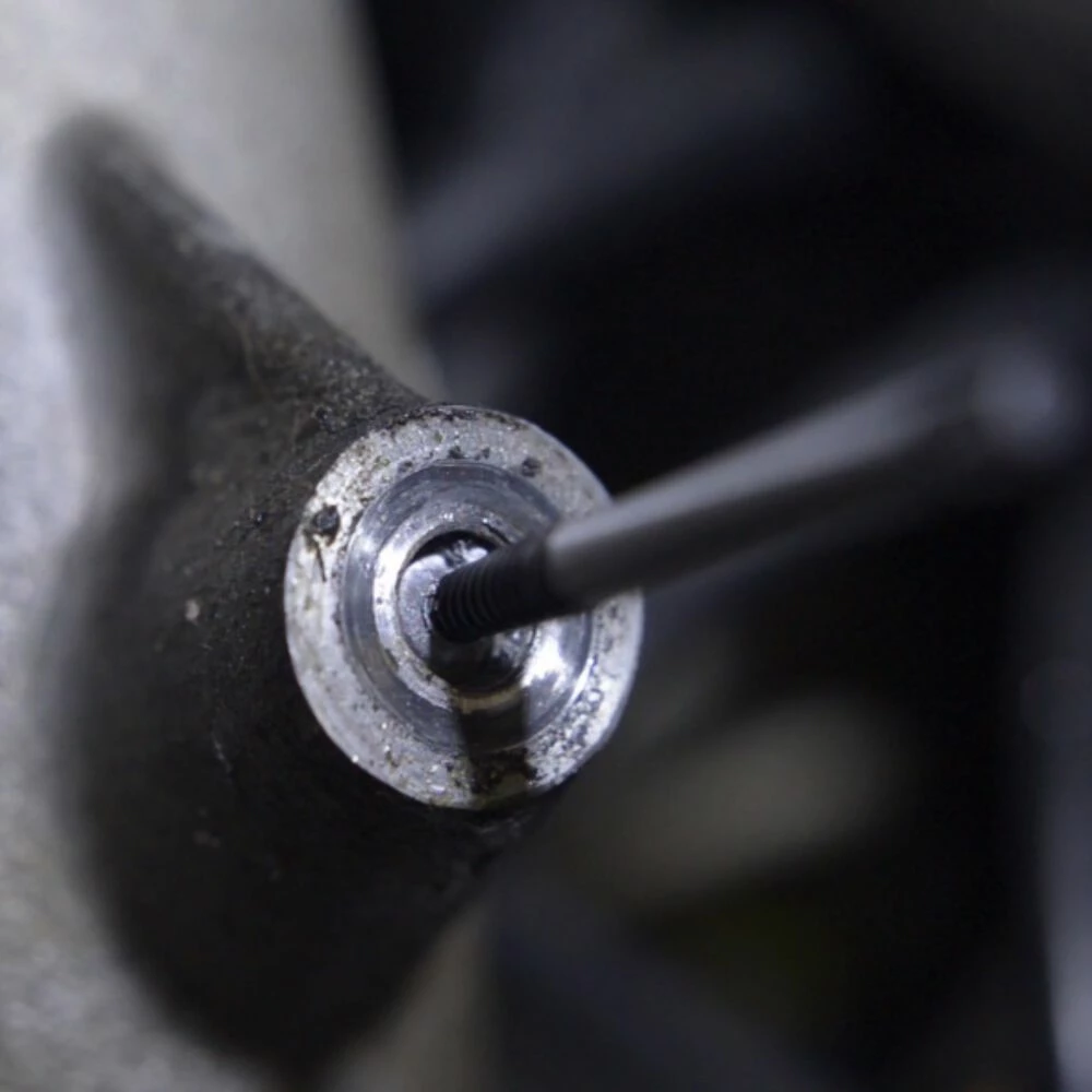 Start the job by marking the centre of the snapped bolt with a centre punch, so the drill bit doesn’t walk. Choose an extractor from the kit as close to the bolt size as possible that won’t ruin the thread on the sides; and drill a hole in the centre of the snapped bolt. Start with a small drill bit, and work your way up to the correct size for your extractor bit. Be careful not to hit the sides of the hole and ruin the thread, and only go deep enough to allow the extractor to bite.