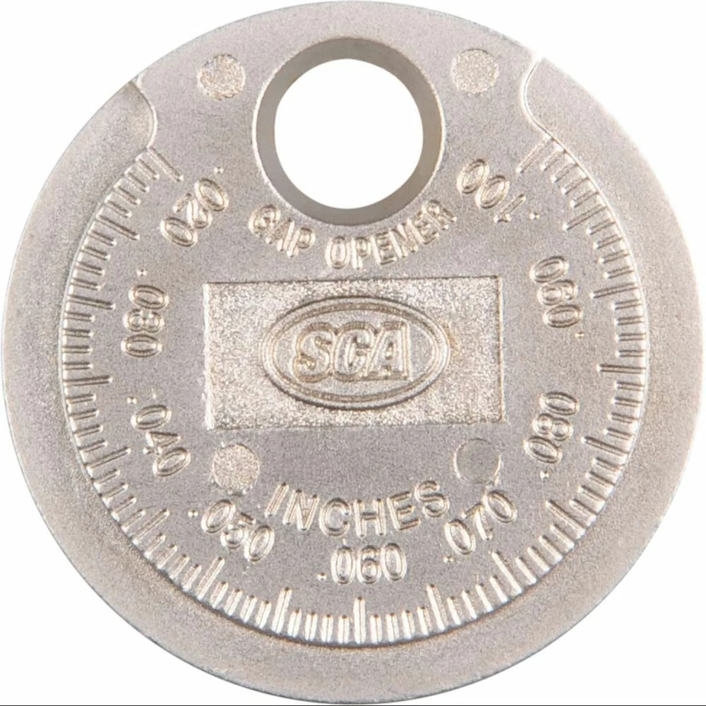 Measure your spark plug gap to obtain its exact dimensions with this solid steel, SCA Spark Plug Gauge Coin measurement tool. This little coin will size up gaps between 0.50mm to 2.5mm (0.02″ to 0.10″) to give you the exact measurements needed to find the right sized new spark plug to replace a worn-out or damaged original piece.