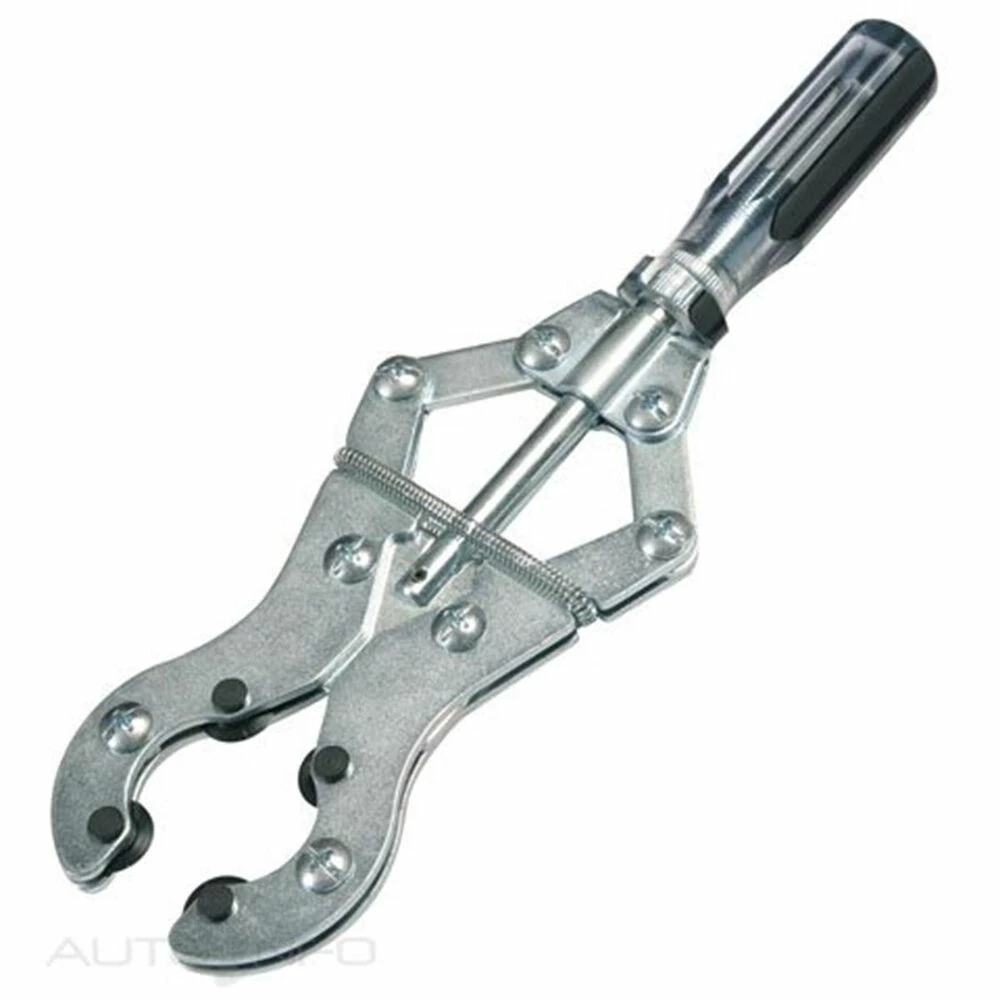 Muffler tailpipe and strut tube cut off tool used to cut round and out of round pipes. Manually operated roller cutter wheels slice through tubing quickly and easily