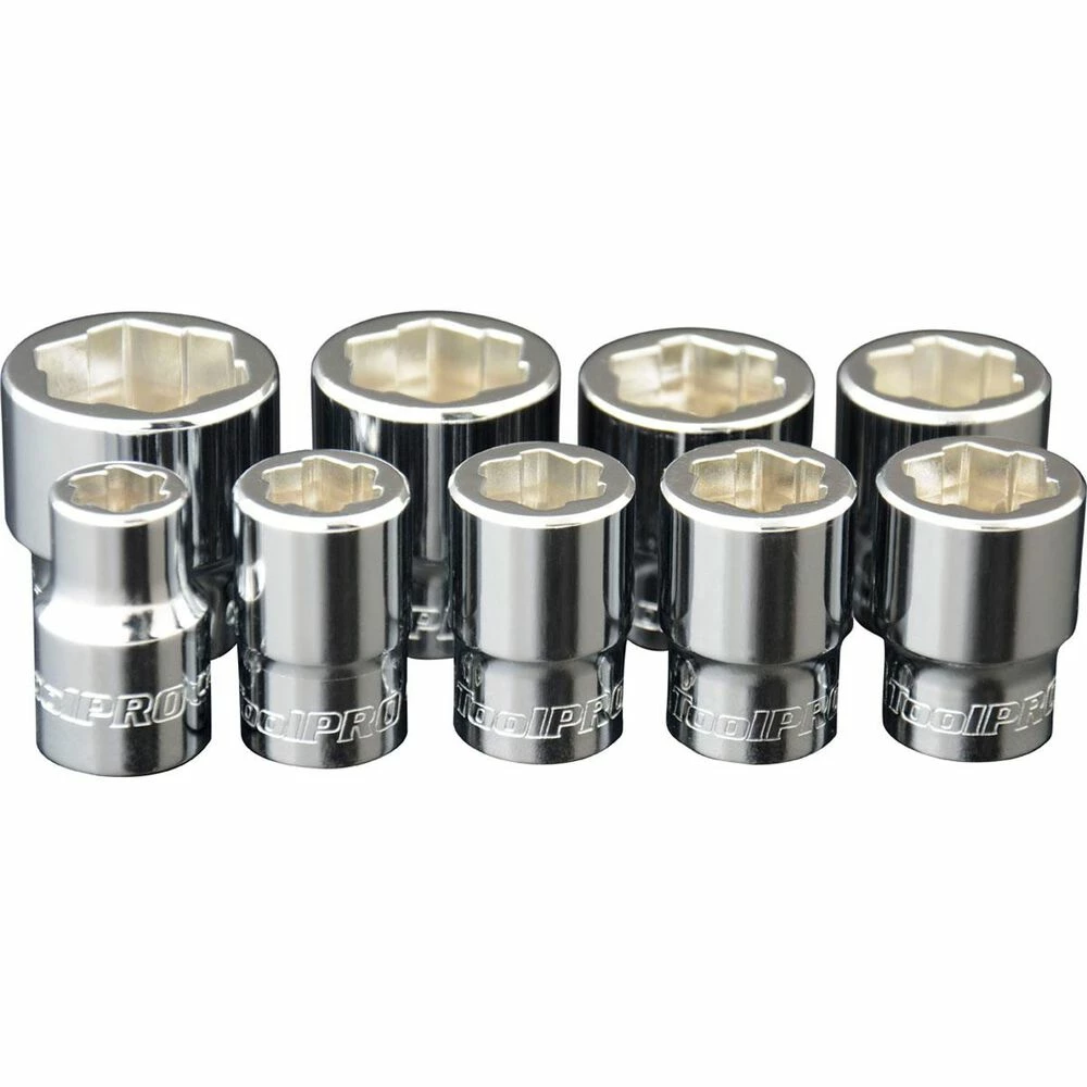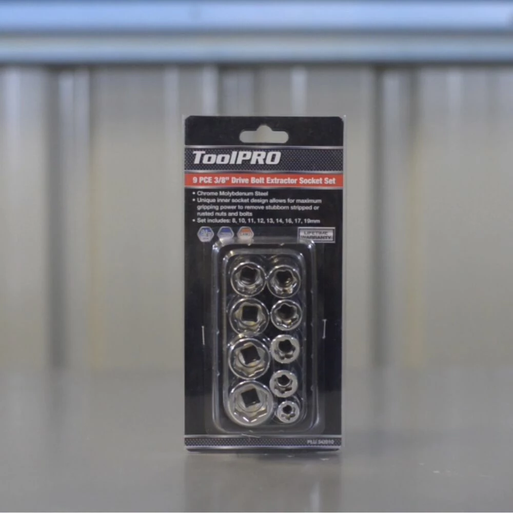 This set covers 9 common socket sizes from 8 to 19mm and their chrome molybdenum construction makes them tough, and ensures they will be corrosion free for years to come. The ToolPRO Extractor 9 Piece Socket Set is suited for a 3/8 breaker bar or ratchet and includes 8, 10, 11, 12, 13, 14, 16, 17 and 19mm sizes.