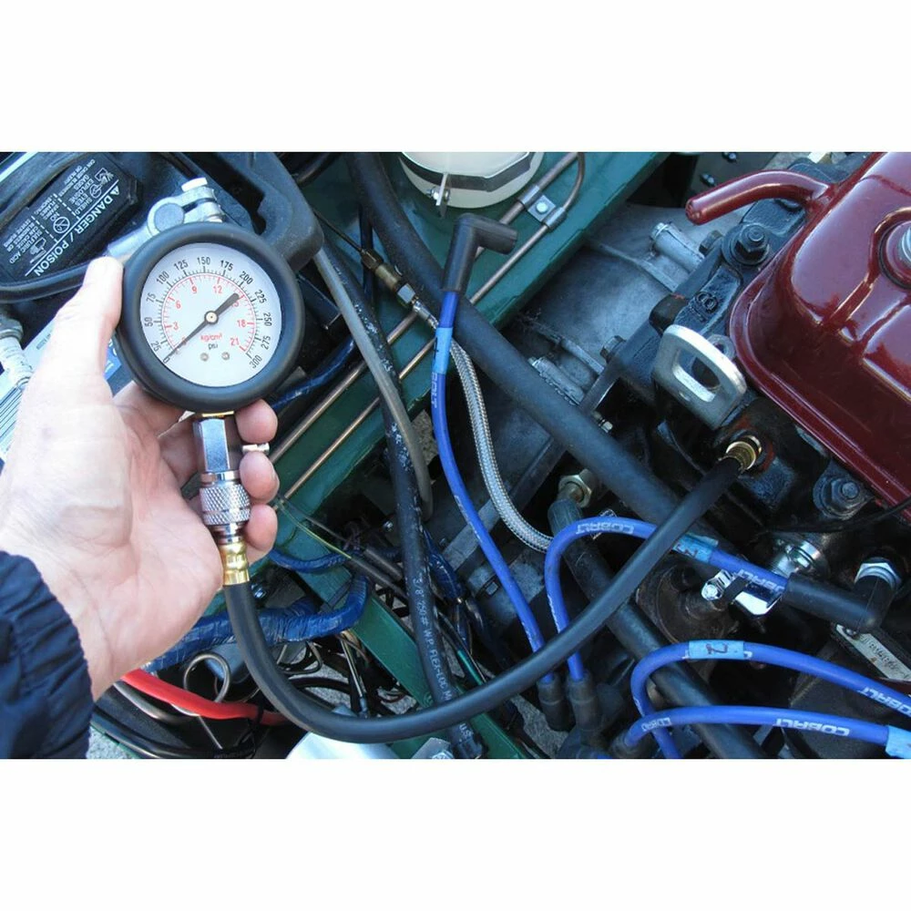 Use the supplied threaded fittings, this will thread into most spark plug holes, replacing the spark plug. In the case that no threaded insert suits the compression fit rubber adaptors can be utilised. When using a compression tester, it is always best to disconnect the ignition system as well as disable your fuel source to prevent the car from starting. Remember, when using a compression tester, you don’t want the motor to kick over; you simply want to crank the motor in order to drive the pistons and produce compression. As this is an advanced tool, it is advisable to read instructions before use along with the service manual of your car.