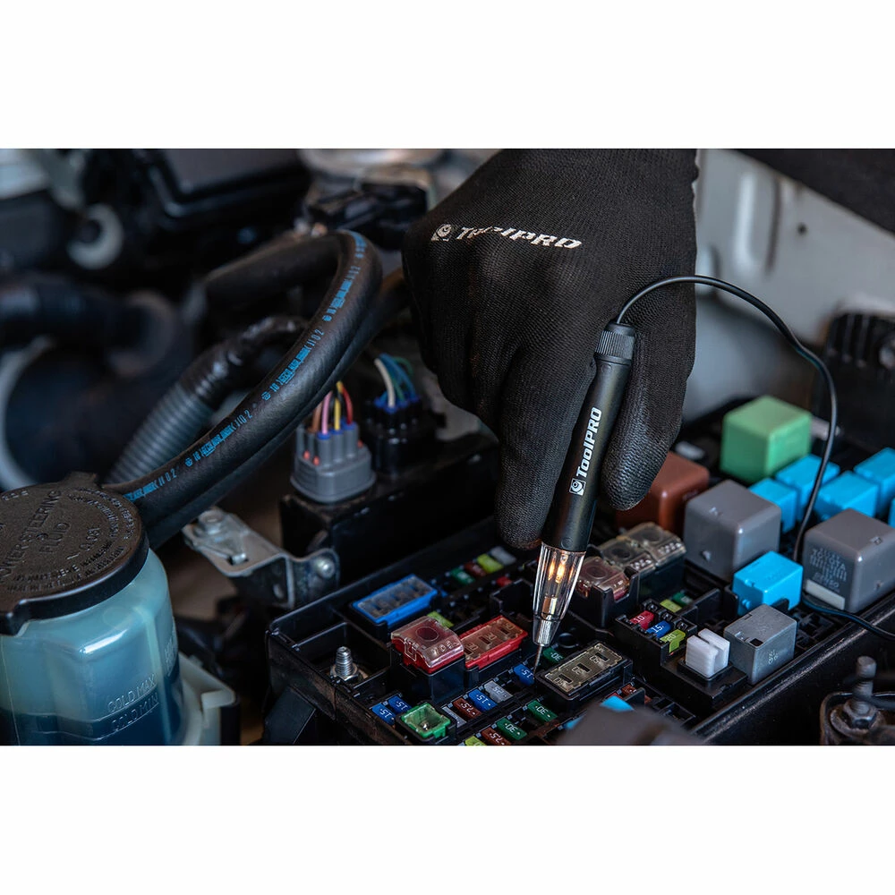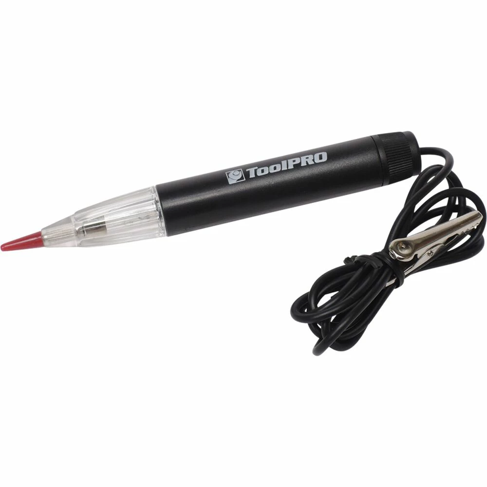 For quick and simple electrical diagnostics; the ToolPRO Circuit Tester is a must have for the tool bag. This compact, pen like tool features an insulated plastic body, incandescent indicator bulb, and a 750mm test lead with an alligator clip. It is suitable for use with circuit voltages between 6 and 24 volts where the lamp will illuminate when in contact with a live power source. With the ground clip connected to a known earth you can probe fuses to determine if they are blown, use it to find a live ignition feed for accessories or trace down electrical faults to find the source of lost power. Grab your ToolPRO Circuit Tester today and eliminate those electrical gremlins with ease.